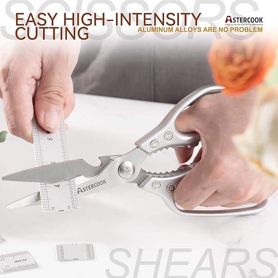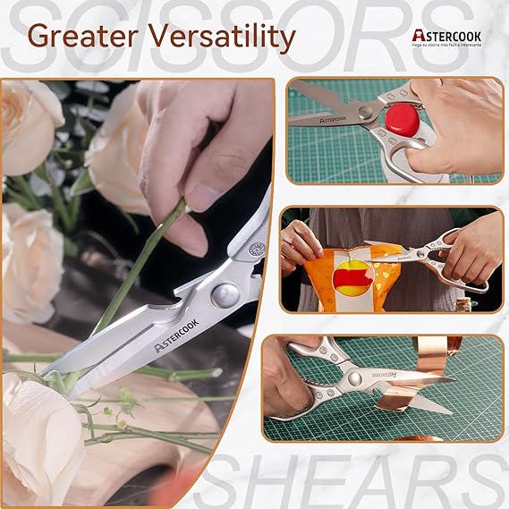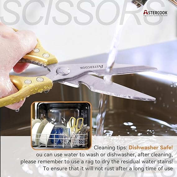 Versatile 2-Pack for Easy Differentiation: Our kitchen shears come in a convenient 2-pack, featuring three distinctive colors - Gold, Sliver. This allows you to assign a specific color to different uses, preventing cross-contamination and confusion in the kitchen. Easily identify the right scissors for each task with style and convenience. Precision Cutting with Blade: Experience precise cutting performance with our kitchen scissors. Enabling enhanced grip and control for effortless cutting. With a length of 9 inches and a blade thickness of 0.12 inches, these shears provide the perfect balance of strength and precision. Multipurpose Versatility for Various Tasks: Our kitchen shears are designed to handle multiple uses in the kitchen. From clipping walnuts to opening bottle caps, they offer a wide range of functionalities, making them an indispensable tool for your culinary adventures. Discover the convenience and versatility of our scissors for a variety of cooking tasks. Comfortable and Easy Maintenance: The kitchen scissors feature a Metal handle that offers a comfortable grip during extended use. The ergonomic design ensures fatigue-free cutting and precise control. Additionally, these shears are dishwasher safe, allowing for effortless cleaning and maintenance. Spend less time on cleanup and more time enjoying your culinary creations. Warranty and Reliable After-Sales Support: We stand behind the quality of our kitchen shears and provide a warranty to ensure your satisfaction. In addition, our dedicated after-sales support team is ready to assist you with any questions or concerns you may have. Your experience and satisfaction are our top priorities, and we are committed to providing exceptional service.