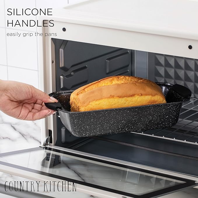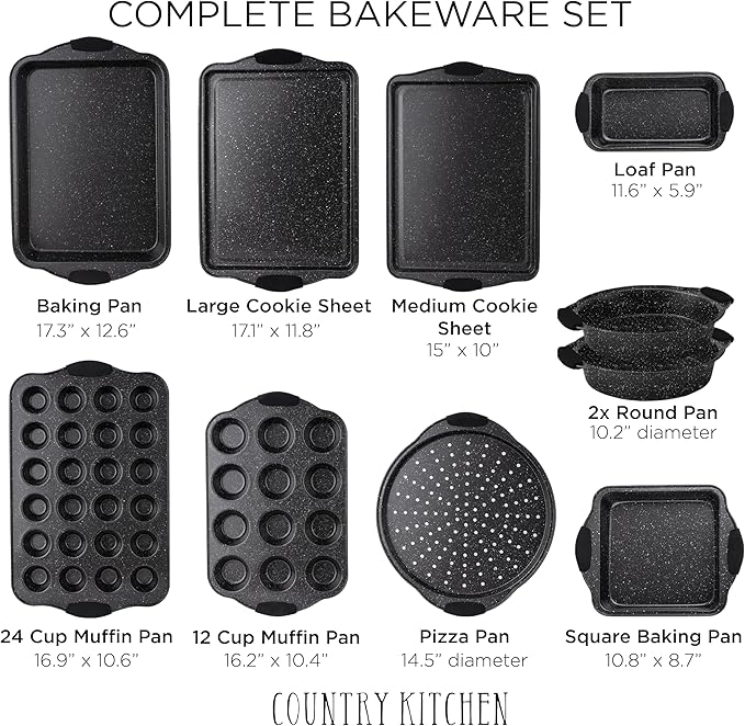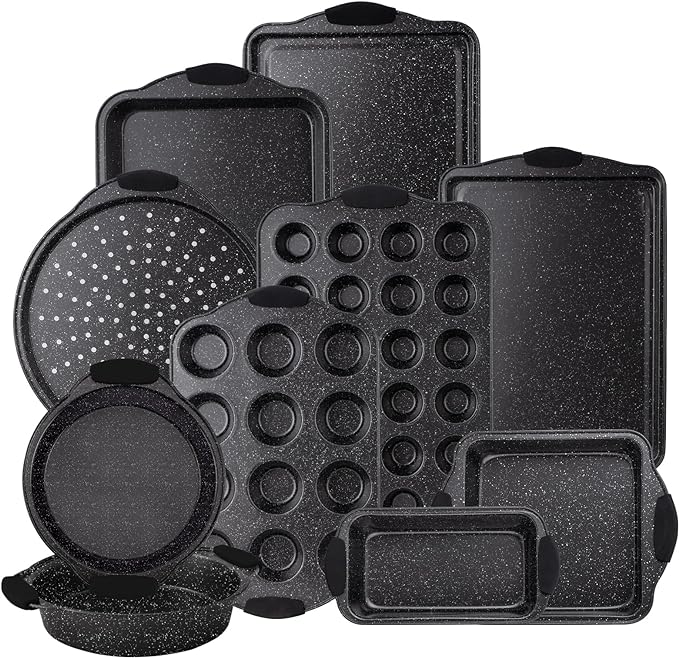 Stackable Bakeware Set: This cake pan set is a stackable bakeware set designed for space efficiency. It's great for small kitchens, saving you precious cabinet space while keeping your baking tools organized. Non Stick Pan Set: The large baking pan and small baking pans are all non-stick. You'll never have to worry about your cakes, cookies, or muffins sticking to the pan again. It makes baking and cleaning up a breeze! Silicone Handles: Our bakeware sets non toxic are designed with safety in mind. The silicone handles ensure a secure grip, allowing you to easily and safely move your nonstick baking sheets in and out of the oven. 10 Piece Baking Set: This space saving beginner baking set includes a variety of pans, great for all your baking needs. It includes a non stick cookie sheet, a large and small baking pan, and more. Nesting Bakeware Set: This nesting bakeware set includes nesting baking pans that fit neatly inside each other when not in use. It's great for those who love baking but have limited storage space!