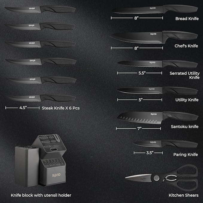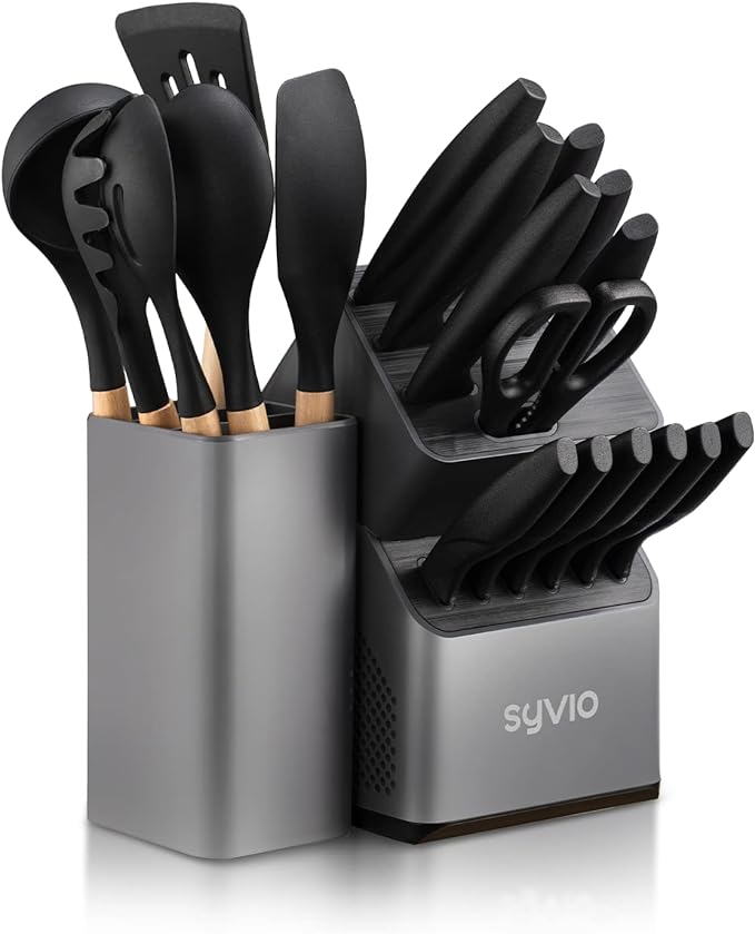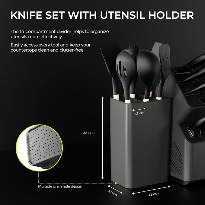 FOOD-GRADE KITCHEN UTENSILS SET: This 6-piece set is made of food-grade silicone and sturdy acacia wood with heat resistance up to 464℉. Sturdy and flexible, it is an ergonomic kitchen utensil with reliable quality, comfort and value. ALL-IN-ONE PERFECT SET: This set includes 8" Bread Knife, 8" Chef's Knife, 7" Santoku Knife, 5.5" Serrated Utility Knife, 5" Utility Knife, 6 PCS of 4.5" Steak Knives, 3.5" Paring Knife, Kitchen Shears, and Knife Block with built-in Knife Sharpener. PATENTED UTENSIL HOLDER DESIGN: The kitchen utensil holder combines form and function to make your kitchen both stylish and functional. The tri-compartment divider helps to organize utensil more effectively. Attaches to your knife block for a clean and organized countertop. HIGH QULITY KNIVES SET: All blades forgedorged with high-carbon stainless steel and adopts BO oxidation technology to wrap the black rust-resistant layer on the surface of the knife, rust and stain-free performance. The juice is not easy to contaminate, easy to clean, more resistant to corrosion. ONE YEAR WARRANTY: This essential knife block set is perfect for both professional and amateur cooks. Perfect for weddings, birthdays, housewarmings, Thanksgiving, Halloween, and more. Hassle-free 30-day trial and 12 months warranty.