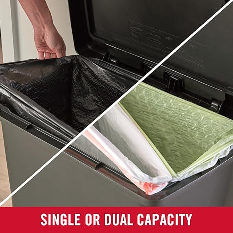 HOLDS 50% MORE TRASH: 19 gallon capacity is greater than traditional 13 gallon, meaning less trips taking out trash​. SINGLE OR DUAL CAPACITY: Can use one 30G or larger liner bag for trash or two 13G or 20G liner bags for separating trash and recycling​. RECYCLING SOLUTION: The option to use dual compartments makes sorting between trash and recyclables even easier. HIDES LINER BAGS: Integrated LinerLock technology hides liner bags from view to maintain a sleek look and secures the bag to the container to prevent slipping.​ SLOW CLOSE LID: Quiet, controlled lid closure is designed to reduce unwanted noise and ease down gently​. HANDS-FREE USE: The foot pedal removes the need to touch the lid during waste disposal to keep hands clean​. STAINLESS STEEL PEDAL: The charcoal stainless-steel foot pedal stands up to daily use​. MADE IN THE USA: Manufactured in Winchester, VA.