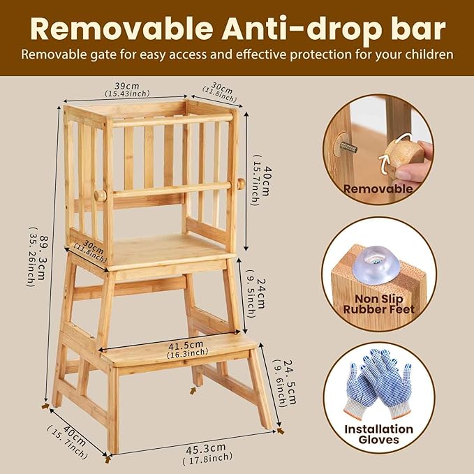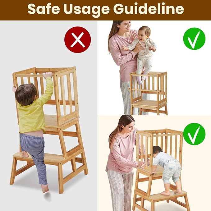 【Unique patented Design】:Our Kids Kitchen Step Stool enjoys the CPC certification (Children's Product Certificate) issued by the federal government. Removable Anti-Drop Railing Safety Rail design has a unique patented design (patent No: USD1,007,881S). 【"A" structure is more stable】: Designed and tested to exceed child safety standards. “A” Shape structure reduces risk of toppling. Non-slip feet. The four-sided railings provide support with an additional removable anti-fall bar as needed. 【MADE TO LAST】: This sturdy tower stool for learning is made from solid natural bamboo with a child-safe, meticulous finish that prevents scratches and scuff marks. Safely supports 150 lbs for toddlers 18 months to 3 years old. 【STRONG AND VERSATILE】: Hand-selected sustainable bamboo is sturdy and lighter than other woods, and has great natural colouring. It also functions as a little table/desk, and as steps that can take the weight of adults when needed. 【EASY TO INSTALL】: Installation Tools and non-slip gloves included, with instructions( video on our product page for your reference) including numbered parts and screws for easy assembly. Note: For any issues please contact us for free replacement parts guarantee, or 90 day free returns.
