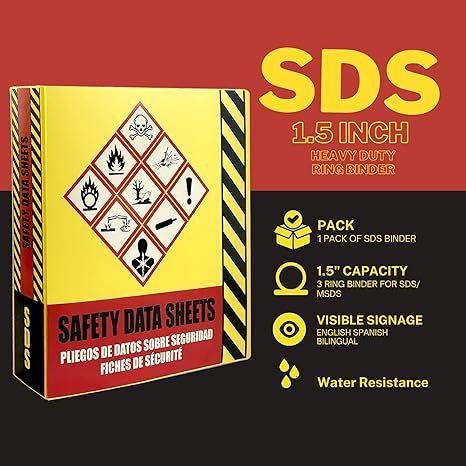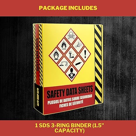 1.5 Inch 3 Ring Binder for SDS/MSDS: Professional binder that complies with OSHA’s 2012 requirements. Includes 3 Inch Round Rings - can fit up to 250 sheets of 8.5 x 11 inch papers, which is the standard size for most documents, including Safety Data Sheets. Impressive Capacity 1.5 Inch Binder: Actual outer dimensions are 12” x 11.8” x 3.8”. The heavy duty 3 ring binder 1.5 inch can hold 250 sheets of standard 8.5 x 11" papers. Highly Visible Large Binder: Yellow safety binder with bright colors make it easy to see and find. The binder is carefully and thoughtfully designed with details not only on the front cover but also on the side. A large "SDS" is printed in a noticeable color on a yellow background, which promotes the visibility of the SDS binder. Durable, Unbreakable SDS Binder: Heavy duty binder which is made of the strongest polypropylene available. It's semi-flexible and resists harmful elements like moisture, stains, and chemicals. Trilingual: Promotes workplace safety awareness among English, Spanish, and French speaking employees in multinational companies. Includes the GHS Pictograms on the cover.