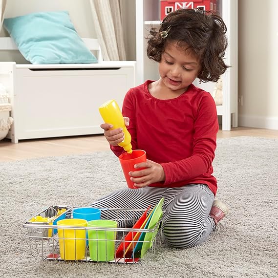 ENTERTAINING 24-PIECE WASH AND DRY DISH SET: The Melissa & Doug Let’s Play House! Wash & Dry Dish Set includes 4 place settings (cups, plates, forks, spoons, and knives) plus a squeezable soap bottle, mesh-covered sponge, and metal drying rack. PROMOTES IMAGINATION: Our play dish set is not only an entertaining pretend play set—it also helps kids develop imagination and creative thinking skills. PAIRS WELL WITH PLAY KITCHEN SETS: This wash and dry dish set works well with one of our pretend play kitchens or can be used as a stand-alone play set. GIFT FOR AGES 3 TO 6 YEARS: This set makes an exceptional gift for kids from 3 to 6 years. Add the Melissa & Doug Stainless Steel Pots & Pans set to round out the hands-on play experience and give kids another engaging option for screen-free fun. “THE GOLD STANDARD IN CHILDHOOD PLAY”: For more than 30 years, Melissa & Doug has created beautifully designed imagination- and creativity-sparking products that NBC News called “the gold standard in early childhood play.”