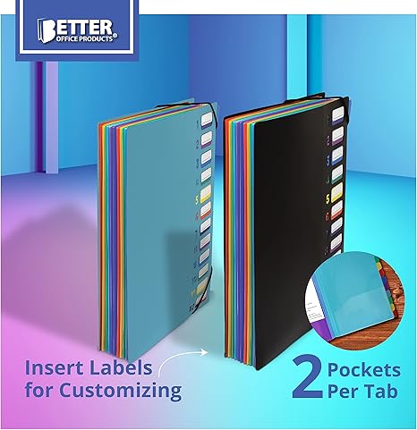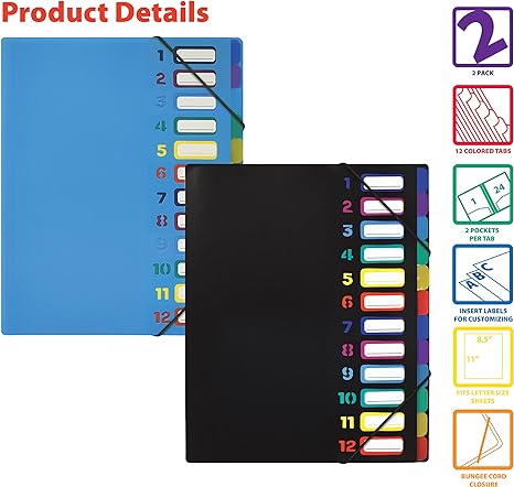 2 PACK - 24 Pocket Organizers, each with 12 assorted color tabs and two adjoining clear pockets per tab LETTER SIZE - Fits 8.5" x 11" papers and documents COLOR CODED - Six (6) colors repeated twice to organize one's files MOISTURE-RESISTANT - Made of water and stain resistance poly to last longer BUNGEE CORD CLOSURE - A stretchy bungee cord closure keeps the upper and lower edges of the organizer secure