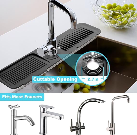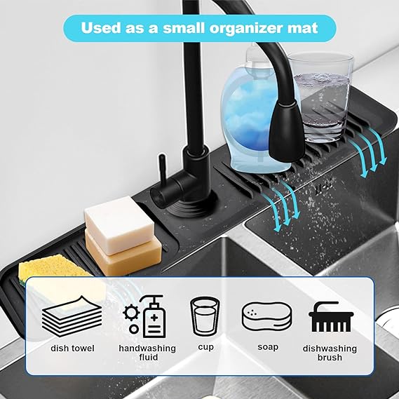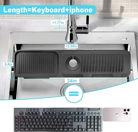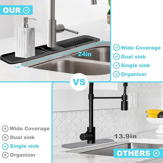 【Multiple Usages】Sink splash guard can be used in kitchen, bathroom, laundry, sink, farmhouse, bar and RV as silicone faucet handle drip catcher tray. 【Upgrate 5°Slope】The latest 5°slope design of silicone sink mats for kitchen sink allows for faster and smoother water discharge and faster drying. This means no puddles to clean up & no water spots by the faucet. Faucet splash guard for kitchen sink give you an effort-saving upgrade. 【Wide Coverage】24inches long size kitchen sink splash guard have a wide coverage,not only can cover the entire single bowl sink, but also be suitable for double bowl sink.Use silicone sink faucet mat splash guard so water will not splash onto the sink surface and keep it clean and hygienic. 【Adjustable caliber】The caliber of sink faucet splash guard can be tailored according to the size of your own faucet, kitchen sink splash guard behind faucet suitable for various scenarios. 【Sink Organizer】Sink water splash guard can also used as kitchen sink organizer with sponge holder and soap dispenser hole, it acts as a storage table for brushes、sponges and detegent to make the kitchen space clean and tidy. 【Silicone material】Faucet mat for kitchen sink 100% silicone,soft and reliable reusable and durable.Better than other splash guard for sink protectors on the market.Just rinse with water or toss into the dishwasher.