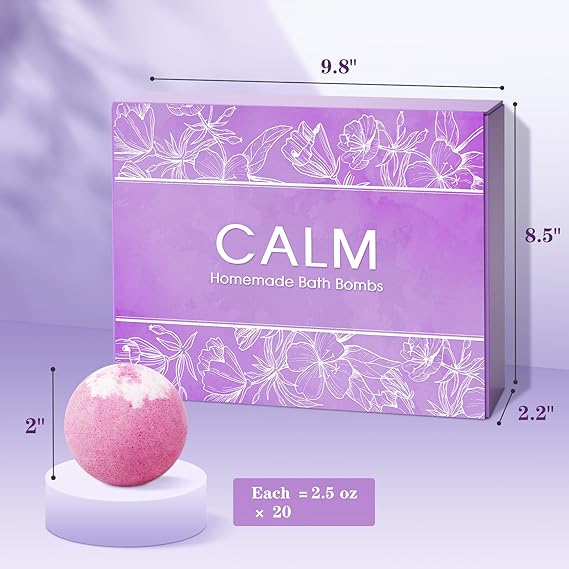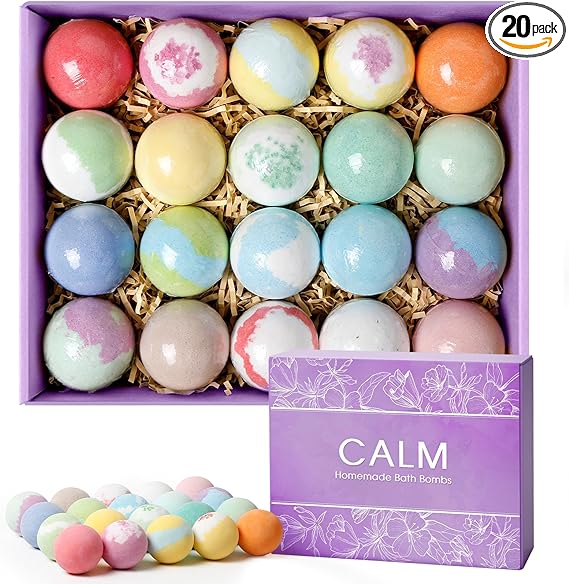 20 Bath Bombs Gift Set: There are 20 types of bath bombs in the box, 10 kinds of fragrance to give a variety of options, and 20 bath bombs will give a more of the ultimate experience. 20 scent-sational bath bombs with different functions, CalmNFiz invites you to explore them together. Wonderful Fizz Effect: Each bath bomb is individually designed and has a high content of natural organic skincare ingredients. The bath bombs float and diffuse colored bubbles on the water. Each bath bomb is composed of multiple colors and releases amazing colored swirls on the water surface, giving you a visual feast. Gentle Ingredients: Our bath bombs create a luxurious bubbles with gentle ingredients and an enchanting aroma. As the rich bubbles envelop you, you are immersed in a relaxing bathing experience. Use our premium bath balls for a fun relaxing time in the comfort of your own home. Recommended Use: Bath bombs dissolve completely in about 5 minutes in 95-113 degrees F water temperature. Its dissolve most quickly when fully immersed in water, and should be stored in a dry place. If you remove the plastic packaging, use as soon as possible. Not recommended for infants under 3 years of age. Amazing Gift Idea: Each bath bomb is individually plastic wrapped and the unique design makes it a great gift option for mom, girlfriend, wife and anyone else on your gift list. Individual tags on each bath bomb make it easy to label for gift giving.