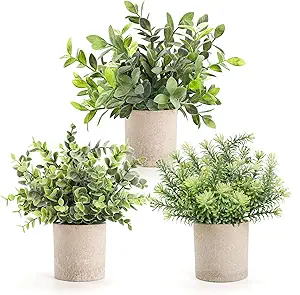 Paper Pulp 【Package】:You will get 3 packs faux plants desktop indoor. The small fake plant measures appr. 9.5" tall. The paper pulp pot appr. 3.65" tall wide 【Durable Material】:Our mini potted artificial plants indoor have eucalyptus leaves that are made of plastic.The pot is made of good paper pulp,please do not put it in the water 【Easy to Care】:No need for much maintenance or care the plastic plants, they will neither wither nor fade. Just occasionally wipe it gently with a damp cloth 【Delicate Design】:The lifelike desk plants can bring green life and freshness to your living space.We adopt a unique design to imitate the frosty gray-green leaves of eucalyptus, and flock the surface of each potted plant. The gray-green leaves make them look more realistic, which is not dust,please don't worry about it! 【Perfect Decoration】:Our eucalyptus plant is perfect for your office, home, desk,bedroom, living room, bathroom, kitchen, farmhouse,balcony,floor,indoor outdoor decor