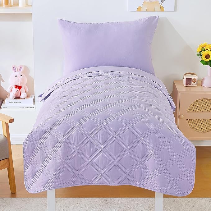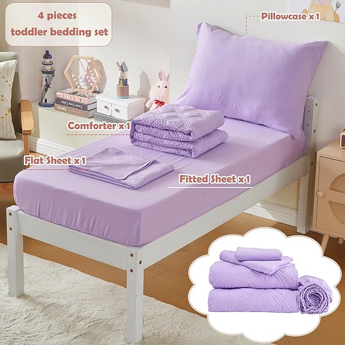 ????BEDDING SET DIMENSION - Toddler bedding set 4 pieces. Includes 1x comforter (42“x58"/107x148cm), 1x pillowcase (20"x30"/51x76cm), 1x flat sheet (45"x60"/114x152 cm), 1x fitted sheet (28"x52"+8"/71x132+20 cm), suitable for toddler girls and boys. ????BED SET MATERIAL - Choose premium quality brushed microfiber, and fill with down cotton, the bedding set is ultra soft, lightweight, breathable, and wrinkle-resistant. The bed set will assure the baby girl and boy a good safe sleep all year around. ????STITCHING BED SET - Super soft lightweight toddler bedding set with a unique diamond pattern quilting process, simple but with a twist. Soft pink bedding set, dreamy lavender bedding set, gentle cream beige bed set, timeless navy blue bedding set, all great choices for little boys and little girls bedroom sets. ????CARE INSTRUCTIONS - The toddler bed sheets set is machine washable. Machine wash in cold, gentle cycle, and separately. Tumble dry at a low temperature. Do not bleach. Do not iron. ????WARM TIPS - Since the comforter bedding set is packaged in a vacuum bag, we highly recommend that you first dry the quilt/comforter in the sun and pat it to make it fluffy.
