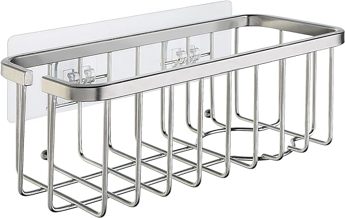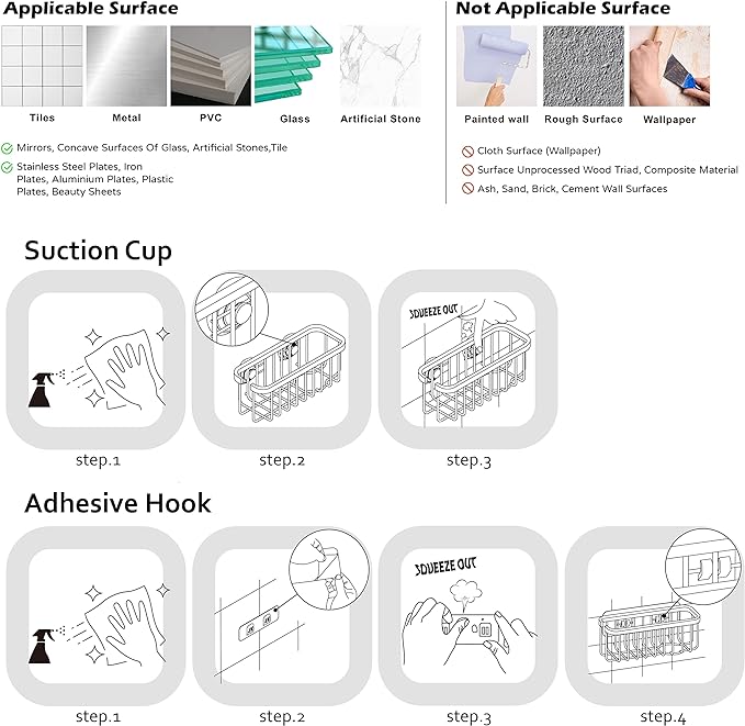 Suction Cups Doesn't Work Well On Natural Material, Like Stone, Cement, Granite, Silgranit, and Marble etc.. Or Surface has rough texture. Kitchen Sink Basket Holds Sponge, Scrubber, Scouring Pad, Drain Stopper, And More! Great For Kitchen, Workplace, Bathroom, Craft Room, Classroom, Or Office Sinks Overall Size 7.48" X 3.3" X 2.75"; SPONGES & BRUSH NOT INCLUDED 304 Stainless Steel Construction Is Rust Proof And Matches Any Decor Dual Plastic suction Cups Easily Stick To Smooth Surfaces For Convenient Drainage, Solid Structure, Solid Weight