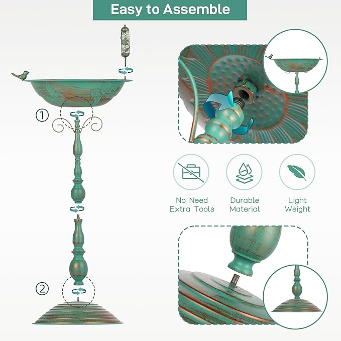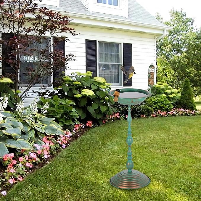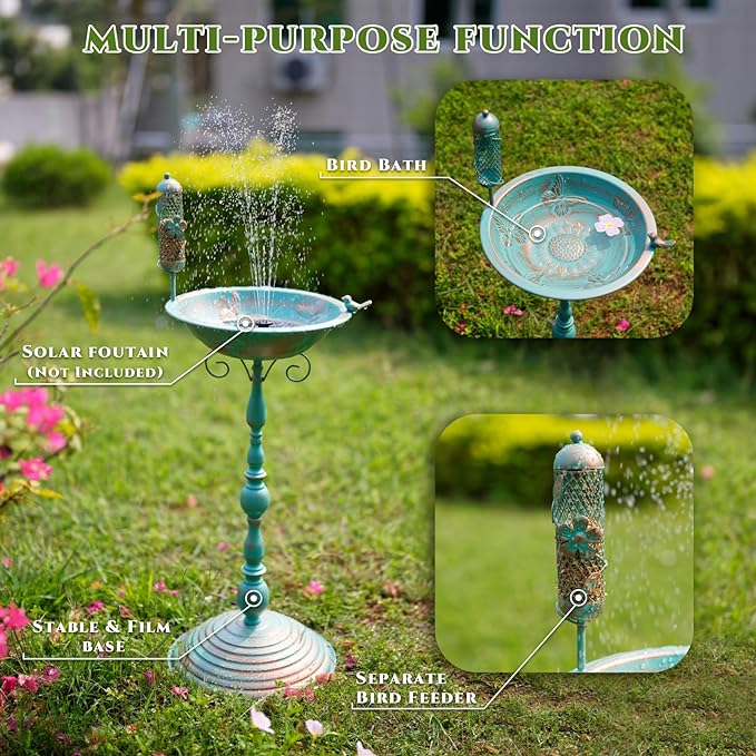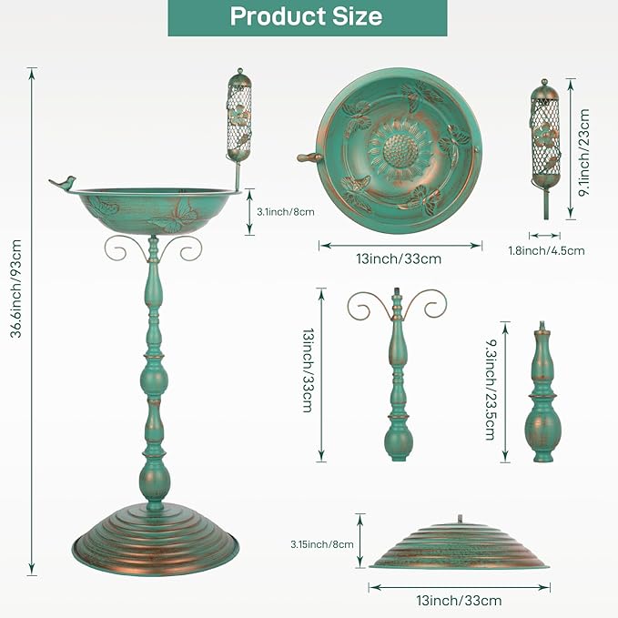 【Elegant Garden Bird Bath】This bird bath exudes a charm of classical elegance. The supporting pole, gracefully curved like a Roman column, imparts a stately presence. The bird bath bowl itself captivates with its delicate butterfly motif, hand-painted in a verdant green hue that harmoniously blends into natural surroundings. 【Durable Material】This bird bath for outside is made of high quality metal and has a protective coating to ensure your outdoor bird bath is durable, rust-proof and provides a lasting home for your bird friends. 【Wide Application】This 13" dia birdbaths for outdoors can be used to hold enough water even hold a solar fountain, and the equipped bird feeder can be used to hold bird seed, ensuring a constant supply of food for birds while bathing. 【Easy to Install】 This bird baths for outside installation is simple and requires no additional tools, just screw together a detachable bowl, bird feeder, metal rod and base. When you want to keep your pedestal birdbath clean, simply wipe the surface of your outdoor birdbaths with a sponge cloth. 【The Perfect Gift】 Our bird bath for outside are practical and beautiful, making it an ideal present for any bird lover on their birthday or during festive celebrations. It is an excellent choice as a gift for parents, grandparents, friends.