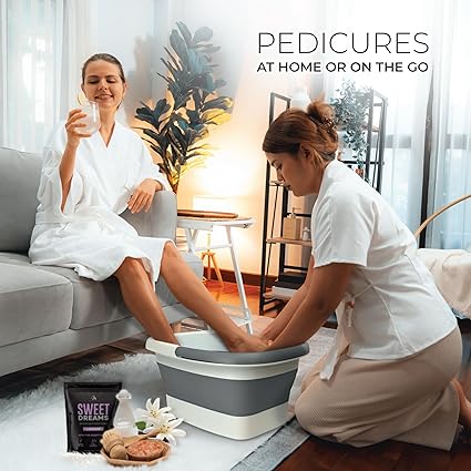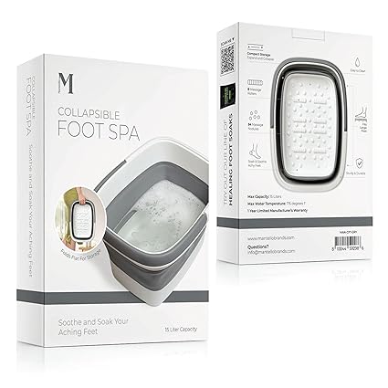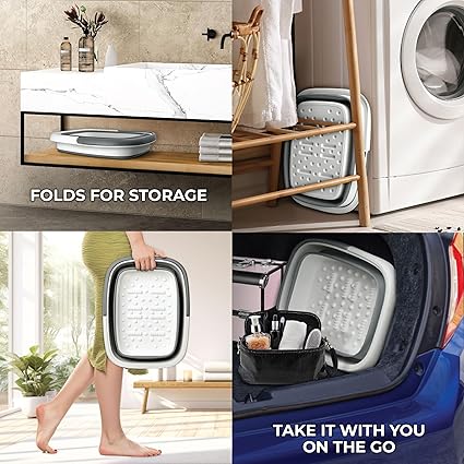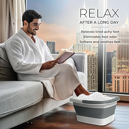 LUXURIOUS FOOT SPA - Indulge in relaxing comfort with our premium foot bath soaking tub. Immerse your feet in the soothing embrace of a relaxing foot bath and let the integrated massage nodes gently stimulate and rejuvenate tired, achy feet. This portable sanctuary offers the ultimate way to unwind and pamper your feet anytime, anywhere. COMPACT SPACE-SAVING DESIGN - Effortlessly fold our collapsible footbath away for storage in tight spaces, and utilize the convenient handle for easy transport. Its lightweight yet sturdy construction makes it easy to store, carry, and set up. Our foldable feet soaking bucket is built to last, durable enough to endure hot water temperatures up to 176°F. MULTIFUNCTIONAL USE - While our large capacity 15L basin is perfect for men's and women's foot care, it's also versatile for use around the home or on the go. Simply fold it up and take it anywhere you need a large bucket with carrying handle. Its easy-to-clean surface, making it suitable for a variety of purposes. FITS LARGE FEET - Our premium feet soaking tub is big enough to fit larger feet with ease, allowing almost anyone to enjoy their own personal spa experience in the comfort of home. Whether alleviating heel or foot fatigue after a long day of work, or simply indulging in some personal time for yourself, our foot tub is your ultimate relaxation companion. GREAT GIFT FOR MEN & WOMEN - Whether treating yourself, a friend, or a loved one, our premium foot bath offers the gift of personal rejuvenation. Designed to provide ultimate comfort and care for tired, achy feet, it promises a rejuvenating experience every time, making it an ideal present for anyone on your list.
