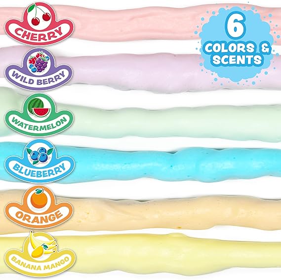 FUN IN THE TUB: Little ones will love getting creative & clean with this bath foam kids bath soap! Our soft, fluffy foam soap is perfect for molding & creating colorful bath art while gently cleansing SHAPE, MOLD & CREATE: Our bath foam for kids is soft & fluffy - the perfect consistency for shaping, molding & creating bath art! Draw on the walls, spray on your body, create floating shapes & more! GENTLE & CLEANSING: Paraben-free, sulfate-free & phthalate-free, this kids soap is formulated to gently clean, leaving skin soft & hydrated - a kids bath & toddler bath must-have! EASY TO USE: Bath Foam for kids is safe, nontoxic & easy to use - simply shake can and press the nozzle to spray out fun, fluffy foam! Use foam to mold & create bath art & then lather up to get clean! MESS-FREE FUN: No clean-up, just fun! This bath foam forms a creamy lather that is easily rinsed off and easily drains from the bath! Non-staining bath colors are perfect for the tub, shower or sink! FUN COLORS, FRUITY SCENTS: Each Foam Soap features a fun, kid-approved color & scent sure to make bathtime a blast! Little ones will love lathering up with these fresh & fruity kids body wash soaps! IDEAL FOR TODDLERS & KIDS: Our foam soap for kids is designed for bath time fun! Perfect for kids 3+, foam soap is the perfect addition to your bath toys for toddlers & kids who love sensory play! VARIETY 6 PACK: Kids Bath Foam Soap Set includes (6) 8oz cans! Bath colors include: Blue (Blueberry), Red (Cherry), Green (Watermelon), Orange (Orange), Purple (Wild Berry) & Yellow (Banana Mango)
