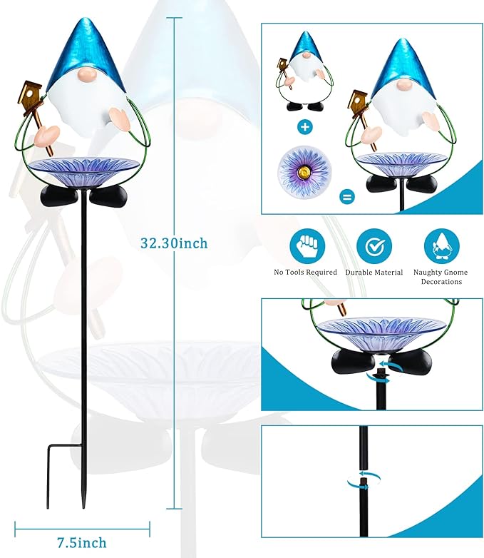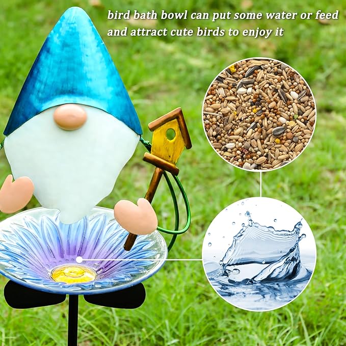 Garden small bird bath bowl holding some water or wild bird food can help to attracting birds to stay, making your yard more vivid with full of variety. Relax to watch cute birds feed in your backyard Birdbath has unique design, added with gnome decorations make it more funny in your yard and equipped with metal stake move glass bird bath to place the perfect spot effortlessly Bird bath is made of durable glass and metal material, small bird feeder bowl with funny metal gnome decoration is suitable for outdoor garden yard lawn outside flower bed Easy to use and make it clean, used as a bird bath for holding some water or a bird feeding tray for holding some seed, suitable as a gardening gift for mother, grandma,all of the nature lover 32 inch height birdbath includes: 1*glass birdbath bowl+2*metal stake part+1*metal gnome decoration+1*assembly instructions. If you have any doubt about gnome birdbath, CONTACT US by email please, we will deal with it asap