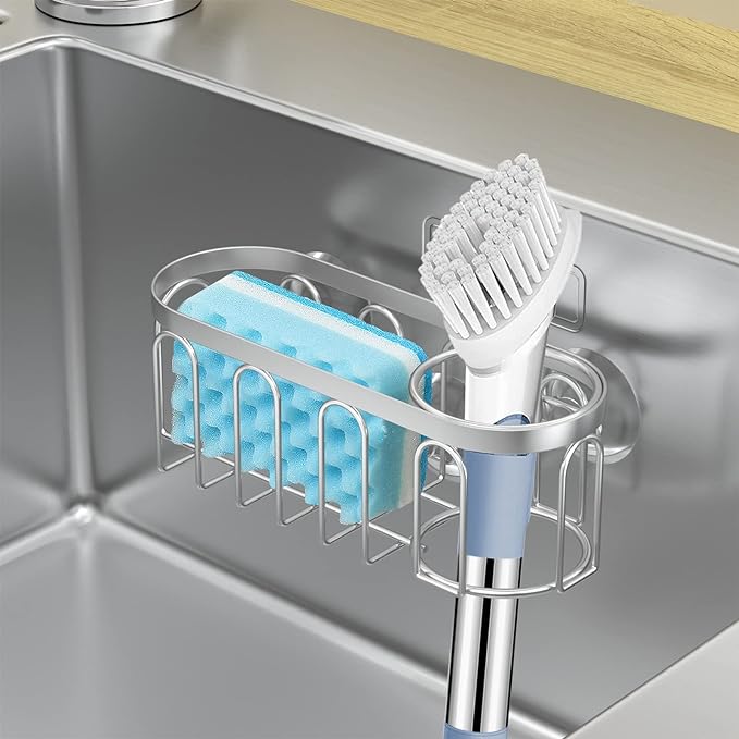 Yazoni 2-in-1 Sponge Holder for Kitchen Sink, Suction Cup Rack/Caddy, No Drill Rustproof Organizer for Place Dishwashing Brush Soap (Silver)
