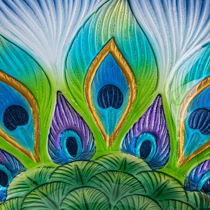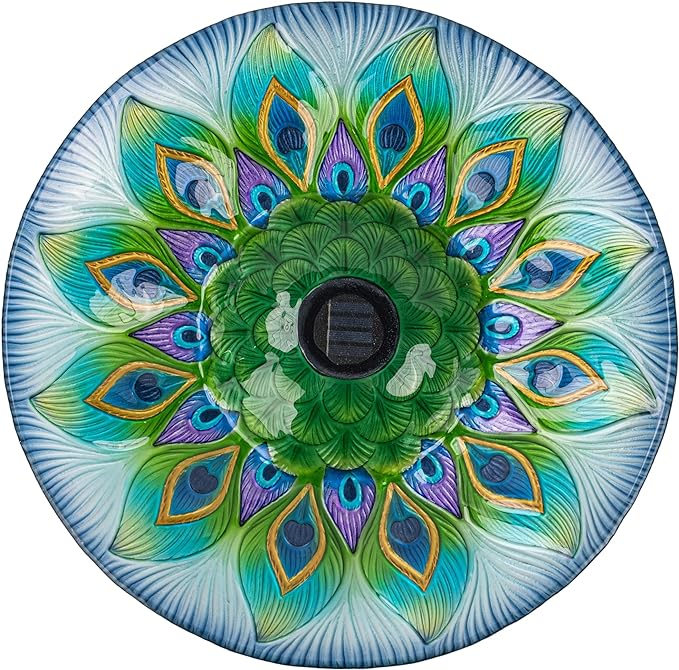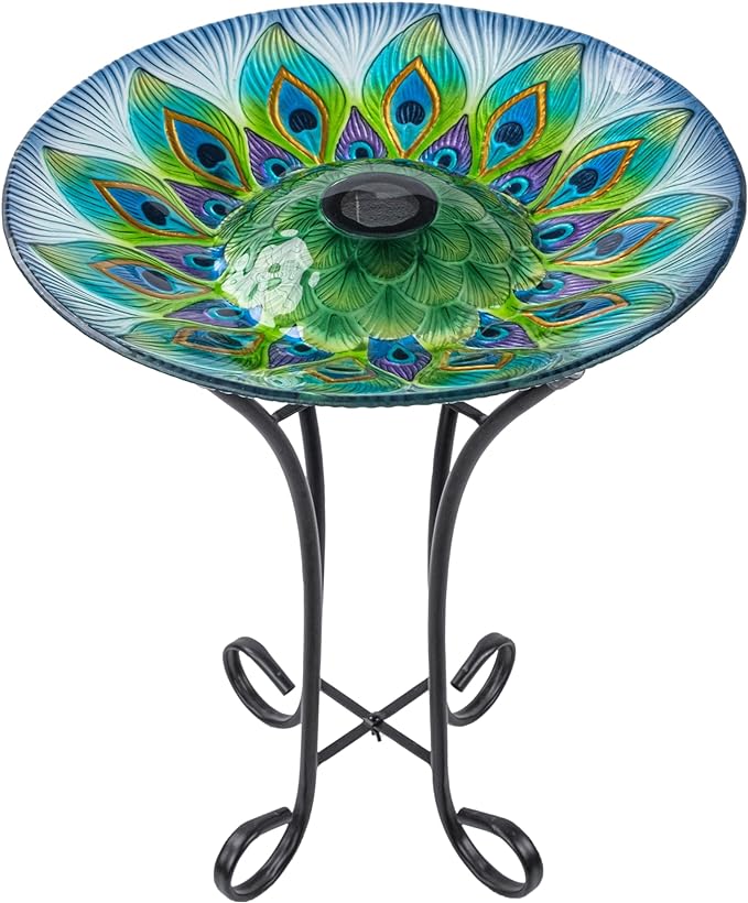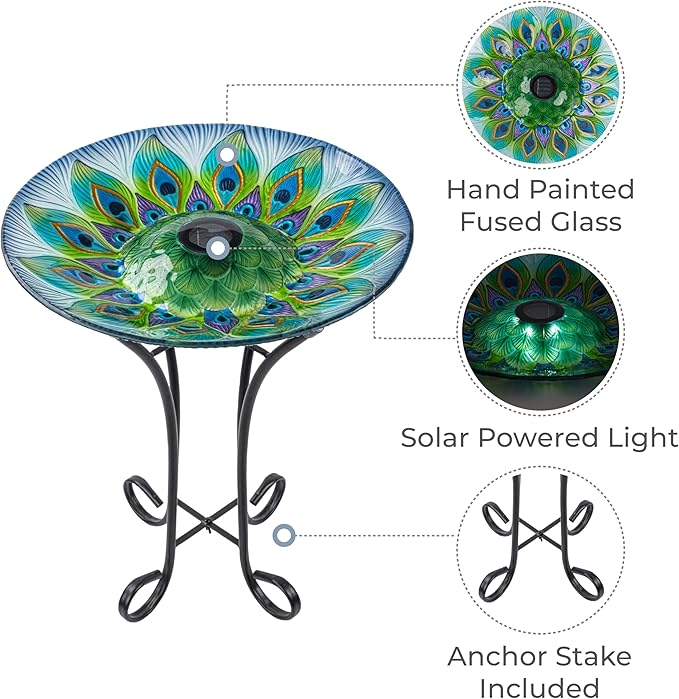 DECORATIVE ADDITION TO OUTDOOR LIVING SPACES: Hand-painted fusion glass bowl in a vivid blue and green peacock feather design SOLAR-POWERED LED LIGHT: Located in the center of the bowl, it charges during the day to illuminate at night VERSATILE PLACEMENT: Foldable stylish metal stand with anchor stake for stability CREATE A BIODIVERSE, LIVELY YARD: Attract birds to your yard or garden DIMENSIONS: 17.8 in. dia. x 20.95 in. H