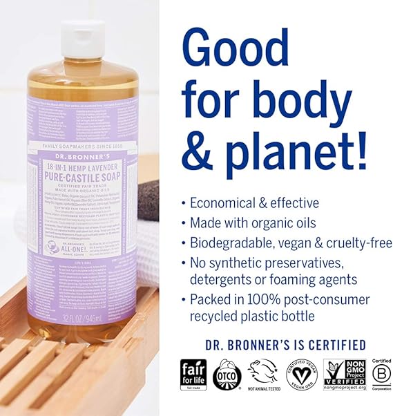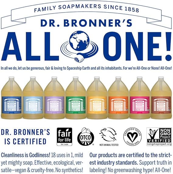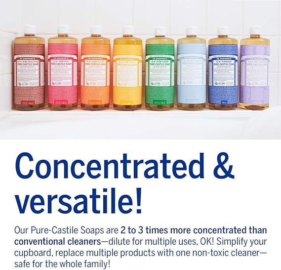 MADE WITH ORGANIC OILS & CERTIFIED FAIR TRADE INGREDIENTS: Dr. Bronner's Pure-Castile Liquid Soaps are made with over 70% certified organic & fair trade ingredients, promoting healthy communities, ethical working conditions & fair prices. ORGANIC & FAIR TRADE PALM KERNEL OIL: Grown by fairly-paid smallholder farmers in Ecuador to ensure sustainable harvesting techniques that won't damage local habitats—providing the smooth & creamy lather of our soaps while benefiting people & planet. NO SYNTHETIC PRESERVATIVES, DETERGENTS, OR FOAMING AGENTS: Our liquid soaps are made with plant-based ingredients you can pronounce—no synthetic preservatives, thickeners, or foaming agents—which is good for the environment & great for your skin! 3X MORE CONCENTRATED THAN MOST LIQUID SOAPS: Dilute! Dilute! Multiple uses for just one product: laundry, mopping, hand-washing dishes, all-purpose cleaning, washing pets & more. More soap per bottle means less waste in packaging! PACKAGED IN 100% POST-CONSUMER RECYCLED PLASTIC BOTTLES: Dr. Bronner's is diverting discarded plastic from landfills by using & increasing demand for recycled plastic bottles. This eliminates waste & has a positive environmental impact!