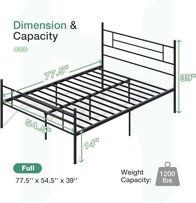 Sleek and Modern: With its minimalist design, our full size bed frame adds a touch of sophistication to any bedroom decor. The sleek lines and matte black finish create an elegant and timeless look that effortlessly complements any interior style. High Quality: Our bed frame is made from premium heavy duty sturdy metal material, ensuring a stable and durable support for your queen size mattress. With a weight capacity of up to 1200 pounds, it provides a secure and comfortable sleep experience. Easy Assembly: Designed with simplicity in mind, our full bed frame is easy to assemble without the need for any additional tools. Save time and effort with our user-friendly construction. Noise-Free: Say goodbye to annoying squeaks and creaks! Our bed frame features a sturdy structure and specially designed joints, reducing noise and ensuring a peaceful night's sleep. Underbed Storage: Make the most of your bedroom space with our bed frame's practical design. The ample 12" clearance under the bed provides an ideal storage solution for your extra bedding, seasonal clothing, or other items.