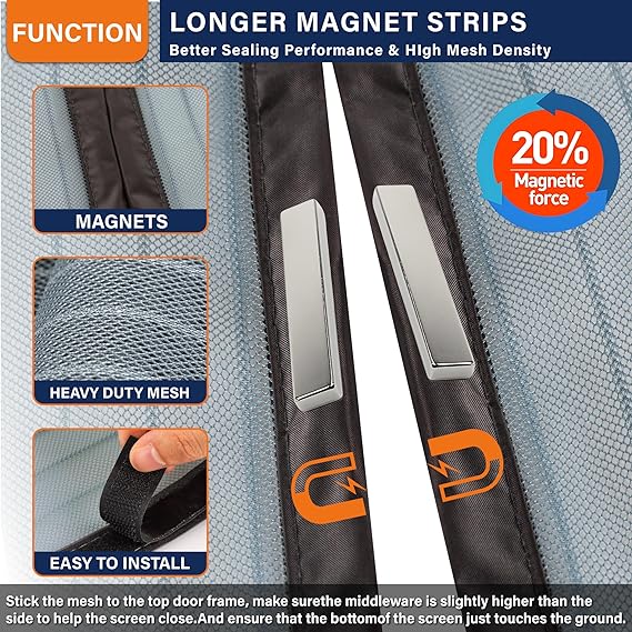 【Keeps Bug Out, Let Breeze In】: Keep annoying insects(flies, bees, mosquitoes ) outside with a Screen Door, The magnetic screen door allows fresh air to circulate while it is shut. our magnetic screen door mesh is the ideal solution to enjoy fresh air and keep bugs at bay! 【Choose The Right Size】 The size of this Mdavo magnetic screen door is 30"x80"-- Fits Door Size up to 36"x98" Max(NOT INCLUDE DOOR FRAME). This screen door mesh with magnetic closure can be attached easily to your balcony door, bedroom, kitchen, children's room or sliding door.Please measure your door frame before purchasing. 【Open Easily & Close Automatically】: The middle seam of the screen door is strategically lined with magnetic cubes (34 pieces magnets for seal and closure are included) allowing the door to open easily and close seamlessly. Even if your hands are full of stuff, it is easy to pass through the fly screen door. Suitable for pets too! Your pets can pass through the curtain as they please! 【Easy To Install】: Mdavo Screen Door is simple to install. No screw, nails and other tools needed. Apply the self-adhesive hook tape on your door frame and apply it on top of the screen door, and it's done! The fly curtain will remain in place for all the summer. It's removable, portable, foldable and washable. Therefore, when winter comes, you can remove it and store it until next year. 【Easy maintenance 】: We strive to provide you with the best quality products and service. So if for any reason you are not completely satisfied with the Magnetic Screen Door, please contact us so We will reply within 24 hours