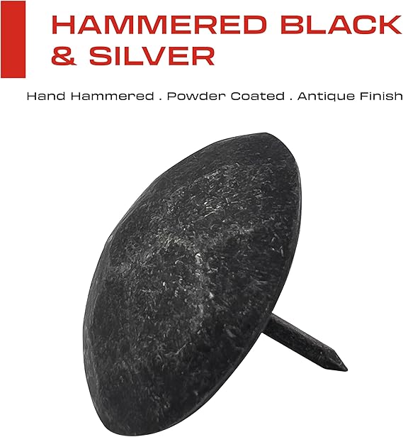 PREMIUM GRADE - These decorative nail heads measure 1" in diameter with a 1" shank. They are the same decorative nails for wood we have been selling to the commercial furniture and ornamental iron fabrication industry for years and now they are available to you BEAUTIFUL FINISH - These decorative clavos nail heads are metal hammered nail heads that provide a rustic nail antique finish QUALITY STEEL - The metal nails are made from high quality steel resulting in a very strong and durable nail. This means less time wasted having to pull out bent nails. Less expensive nailheads are made from cheaper steel and are prone to bending when being installed which results in frustration and lost time EASY INSTALLATION - These can installed by simply using a rubberized tack hammer and either a nail spacer tool or a set of needle nose pliers. If using a nail spacer tool, follow the directions as indicated by the tool. If using the needle nose pliers, hold the nail portion of the tack in place with the pliers and hammer the tack into a firm wooden surface IDEAL USES - These metal clavos can be used on all sorts of different furniture and craft projects including headboards, sofas, loveseats, chairs, benches, ottomans, custom iron work such as wooden doors, wood gates or any piece of wood that needs updating or could simply use a little extra character. They are even a great note holder on your corkboard at home
