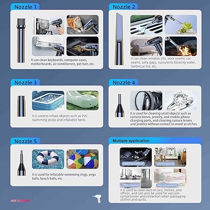 【Adjustable 3 Speed Modes 】:The air duster has a maximum speed of 100000 RPM motor with 3 different air speeds with button.You can have a deep cleaning,low energy consumption and low noise work on the different equipment while retaining powerful airflow. 【Rechargeable Battery and Fast Charging 】: The cordless dust collector has a built-in 7500mAh battery, which can run continuously for 20-30 minutes. Comes with USB-C fast charging cable, fully charged within 3-4 hours (green light is always on: fully charged), can be charged by computer, mobile power supply, car charger, adapter.high-definition LED display screen which allows you to view the remaining battery level and the wind gear. 【Multiple Uses and Versatility 】: Compressed air comes with 5 sets of nozzles.Suitable for dust removal of computer cases, keyboards, cars, fans, lily windows, etc.and our cordless air blower as Alternative to Compressed Air can be recharged and used repeatedly. It is an environmentally friendly, energy-efficient, and cost-saving cleaning product. 【LED Lights & Cordless Design 】The air duster has an LED light, allows lights up hard-to-reach areas, enabling you to spot hidden dust and debris easily. Your cleaning process, ensuring a thorough and efficient clean.Brings great convenience to your cleaning work.it's small, lightweight, comfortable to hold, and easy to carry around 【100% RISK-FREE PURCHASE】: TEKIK guarantees to serve you! We offer a one-year warranty for this electric air duster. We hope you are happy with this compressed air duster! Owning it will bring you more pleasure. If you have any questions, suggestions, ideas, please feel free to contact us! In addition, our cordless air duster do not produce chemicals, liquids or ice during the cleaning process. [NOTE]:To prolong battery life, recommended fully charge before storage.