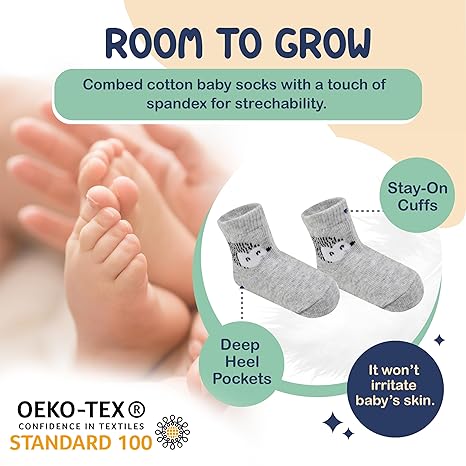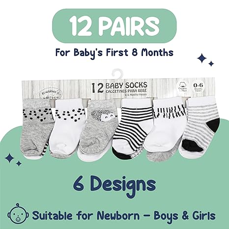 75% Organic Cotton, 23% Polyester, 2% Spandex Imported Organic, Skin-Friendly Comfort: Embrace your baby's feet with the pure softness of Mother's Choice baby socks. Our organic cotton fabric is gentle and hypoallergenic, ideal for newborns' sensitive skin, ensuring comfort without the risk of irritation. Stay-On Technology for Active Babies: Designed with your baby's activity in mind, our socks feature a unique stay-on technology. They provide a snug fit that stays in place throughout the day, perfect for babies aged 0-6 months who are always on the move. 75% Organic Cotton, 23% Polyester, 2% Spandex. Easy Care and Long-Lasting Quality: Durable and easy to maintain, these socks are built to last. Machine washable and resistant to wear, they keep their soft feel and vibrant colors wash after wash, saving you time and ensuring long-term use. Adaptable and Fashion-Forward: Our socks come in a range of adorable, gender-neutral designs and colors. Each pack offers different styles, making them a versatile choice for any outfit and occasion. They're not only practical but also add a stylish touch to your baby's wardrobe. Ideal Gift with Exceptional Value: Presented in attractive packaging, this pack set is an excellent gift choice for baby showers or as a thoughtful present for new parents. It offers remarkable quality at an affordable price, providing both style and functionality.