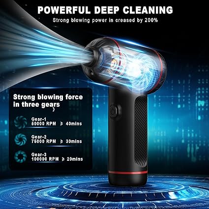 Powerful and effective:The compressed air duster has a maximum speed of 100000 RPM motor with 3 gear adjustable airflow settings,long press switch for 3 seconds can switch the device on & off. built-in LED lights helps you easily clean debris and dust from any corner. Energy Saving type C charging:Electric air duster comes with Type-c charging cable (green light is always on: fully charged), It is equipped with a built-in 7500mAh battery, allowing for continuous operation for 20-40 minutes. Comprehensive Cleaning Kit:The air duster is equipped with 5 nozzles and 3 brushes, you can select the corresponding accessories according to the usage scenario,It can clean dust and other impurities from electronic devices, computer keyboards, office desks, and vehicle interiors, allows you to tackle various cleaning tasks with ease. Alternative to Compressed Air:Compared with compressed air can, our cordless air blower can be recharged and used repeatedly, bringing great convenience to your cleaning. It is an environmentally friendly, energy-efficient, and cost-saving cleaning product. Lightweight and Portable:The cordless air duster is easy to carry, lightweight, and comfortable to grip. The battery is equipped with temperature protection, current protection, and short circuit protection, ensuring the safety of the device throughout the charging process. It is a perfect choice for dust cleaning in homes, offices, and automobiles.
