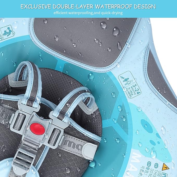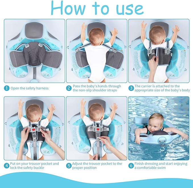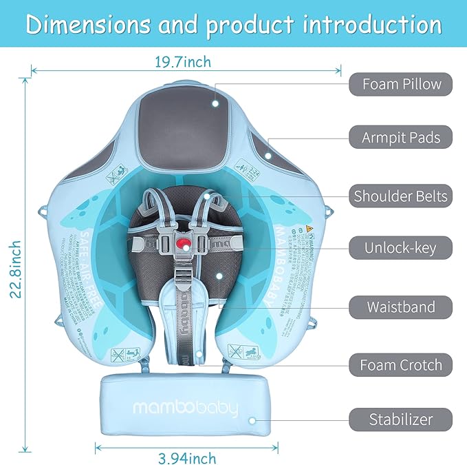 The baby float pool uses PU quick-drying fabric and strong lining. Floatability is more stable. Suitable for children weighing from 13 to 40 pounds. Suitable for children from 3 to 24 months. The adjustable buckle on the back fits most baby sizes. This is easy to adjust. Release the safety clip and slide it up easily. You can tighten it as needed to avoid slipping. Help you move freely in a comfortable position. The baby swimming buoy is equipped with a removable canopy. The detachable UV protection canopy cover is covered with UPF 50+ sunscreen paint to protect the baby's skin from the sun. Let your baby enjoy swimming in summer. the mambobaby float can folded to be small size, much convenient to carry out. Non inflate, never leak, no need take pump to inflate, more secure and easier use. Tilt the top of the head 40°, providing a comfortable posture for swimming learning. The upgraded seat belt buckle provides 5 support points, and the belt extends between the legs to hold the bottom to prevent the baby from slipping into the water. One-touch locking button with lid, fast, convenient and safe.