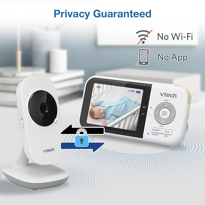 Best-in-class Battery Life and Range - With up to 19 hours of video streaming on a single charge, this system lets you monitor your baby throughout the night easily. During the day, this monitor system's dependable long operation range up to 1,000 feet, lets you go about your day and stays connected with your baby from another room or even from the yard. Privacy Guaranteed. No Wi-Fi or App Pairing - Trusted by US families for more than 3 decades, each VTech monitor is transmitted via secured internal 2.4GHz channel with FHSS technology, so you can rest assured that you're the only one who can hear and see your baby. 2.8" Display Seeing Your Baby in Full Sight Day and Night - The 2.8" display shows your adorable baby's body in full view - no movement is over-sighted. Need more detail? The camera zooms up to 2 times. Soothing Lullabies and 2-Way Talk - Gently lull your baby to sleep with 2 calming melodies and 2 sets of ambient sound. Besides, this system supports 2-way talk back, lets your baby to hear the sound of your voice no matter where you are. Auto-on Screen and Sound Indications - Understand that your rest is as important as your baby's, the monitor's screen can be turn off and the sound be muted to let you the silence needed and to save power. Be rest assured that while it is off, it is still monitoring the baby in the background. When it picks up any sound over your VOX settings, the screen will automatically turn back on. The 3-level sound indicator on the parent unit can let you visually alerted when baby is crying. Easy Set-up Plug and Play - The parent unit and the camera are configured for monitoring right out of the box - no pairing or connections required. The camera can be set on desk top or wall mounted. Temperature Sensor - The built-in temperature sensor on the baby camera will send alert to the parent unit. Lets you know when it’s time to adjust the thermostat.