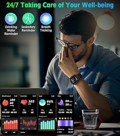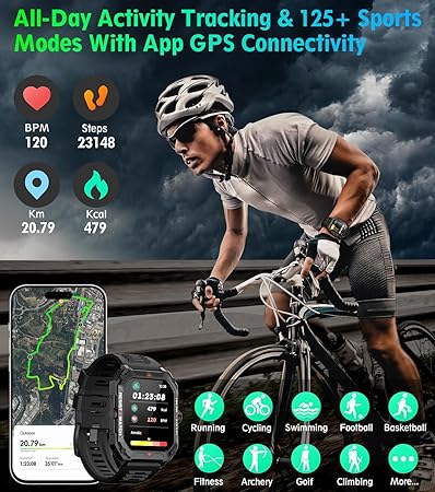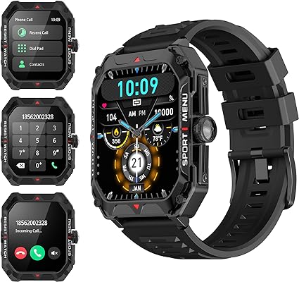 【Superb Visual Experience & Effortless Operation】Dive into the future with 2.02-inch large and ultra high resolution display, every interaction on the smart watches for men is a visual delight with vibrant colors and crisp clarity. Experience convenience like never before with the intuitive touch controls and 2 shortcut buttons plus 1 rotatable digital crown on the smartwatch. Navigate through menus, switch between apps, and customize settings with seamless precision. 【Military Quality & Rugged Smart Watch】Engineered to military standards, the military smart watches for men is built to withstand the toughest challenges. Whether you're hitting the gym, braving the great outdoors, or conquering the urban jungle, the rugged smart watch is up to the task. Bid farewell to the hassle of frequent charging with these mens smart watch for iphone and android phones. Enjoy an 7-12 days of use on a single charge, ensuring uninterrupted usage no matter where life takes you. 【Answer/Make Calls, Receive Messages & AI Voice Assistant】Integrated high-fidelity microphone and speaker, the mens smart watch support notifications for incoming call and messages. You can make/receive calls and read messages directly from your wrist without taking out your phone. Never miss a beat, stay in touch with loved ones, and stay informed of important updates wherever you are.You can also make calls, play music, set alarms etc. through the AI voice assistant. 【24/7 Health Monitoring】The fitness tracker watch for men pack heart rate, blood pressure and blood oxygen monitors. You could check those real-time health metrics anytime, anywhere from your wrist and view the data record in the App. You could turn on 24/7 heart rate tracking and set max heart rate alert in the App. The mens fitness watch tracks different sleep stages for REM, light and deep sleep,and the time when you wake up, helps you to get a better understanding of your sleep quality. 【120+ sports modes & All-Day Activity Tracking】There are more than 120 sports modes available in the tactical smart watch, covering almost all daily sports activities you can imagine, gives you new ways to train and advanced metrics for more information about your workout performance.The all-day activity tracking feature monitors your steps, distance, and calories burned all the day, so you can see how much progress you've made towards your fitness goals. 【Essential Assistant for Daily Life】The military smart watches for men provide you with more features including drinking water reminder, sedentary reminder, real-time weather display, remote camera shooting, music control,timer, Stopwatch, finding phone, Alarm Clock, and do-not-disturb mode, making it a considerate life assistant. With the GPS connectivity, you could get a map of your workout route in the app for outdoor activity by connecting to your phone GPS. 【Wide Compatibility & 1-Year Warranty Promised】The smartwatches are compatible with Android 4.4 / iOS 8.4 or above smartphones . Its durable, replaceable and washable strap with secure clasp offers comfortable fit. With over 250 watch face options and customizable dials, express your unique style and mood effortlessly. From classic analog designs to futuristic digital displays, there's a face for every occasion.