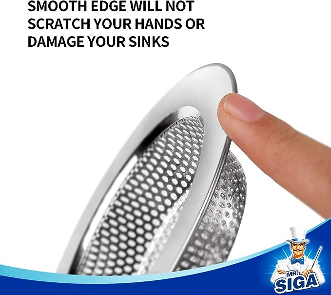MR.SIGA sink strainer is compatible for most standard kitchen sinks as well as bathroom and utility sinks, it is made of stainless steel durable construction which is built to last. High density mesh traps food scraps efficiently without stopping the flow of water, keeping your drain from creating blockage. The outside rim provides the drain strainer a secure sitting over the drain. Smooth edge will not scratch your hands or damage your sinks. A perfect tool to keep hair, residues, debris from clogging your sink drains. Outer Diameter 4.4 inch/11.2cm, Inner Diameter 3 inch/7.6cm, Depth 0.87 inch/2.2cm. MR.SIGA's mission: Make your housework easier, and make the world cleaner. If you’re not happy about the product, you’re covered by a full refund. Please do not hesitate to contact us with any questions you may have, we are here for support and advice!