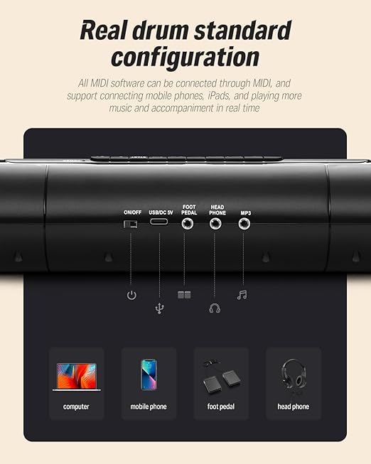 ????[Fun Drum Pad Machine] DED-20R electric drum pad 's high-quality sound source sample is taken from a real drum source, faithfully reproducing the acoustic drum's sound. 7 drum sets(1 SNARE, 1 CRASH, 1 RIDE, 1 HI-HAT, and 3 TOMS), 12 demonstration songs, and 9 accompaniments were set up to accommodate the needs of performance and entertainment. ????[2.2W Stereo Dual Speakers] The DED-20R electronic drum pad has two fantastic stereo speakers that deliver the powerful, impactful sound you want. The volume of the electric drum set can be adjusted to 9 different levels and you can adjust the volume according to your needs. 180s-long recording function can record a drummer's Moment of inspiration and enhance their creative potential. ????[Quiet, No Worry From Noise] Donner electronic drum set is made of high-quality soft silicone, which can reduce the noise when drumming. It supports a 3.5mm headphone output, you can wear a set of headphones to improve your technique without disturbing your family, roommates, or neighbors. It is so easy to store that you can roll it up, and pack it in your bag. ????[MIDI Connect & Gameplay] Come with standard midi out jack and USB midi out jack, you can connect the drum to computers to produce music or play games, or connect external speakers for family entertainment/birthday parties. Perfect for adults who need MIDI functionality and children for entertainment. ????[40 Free and Entertaining Drum Lessons from Melodics] We have carefully created drum teaching courses for users ranging from beginner to advanced, which can effectively help drummers practice beats, build a good sense of music, and improve learning efficiency. 40 free and entertaining courses are sufficient to master all aspects of arrangement creation. Then comes your free time to create!! Remember to get the course from customer service! ????[Ideal Music Enlightenment Toy Gift For Kids] You can send the DED-20R electric drum set for your kids, families, and friends as gifts for Birthdays or Christmas. It contents:1 x electronic drum pad(mobile power charging support), 1 x power adapter, 1 x USB data cable, 1 x 3.5mm audio cable, 1 x drum sticks, 2 x drum pedals. Any questions contact us. ✔️[Tip] The strike force of DED-20 is single and does not change as the strike force increases. We do not offer subscription services.