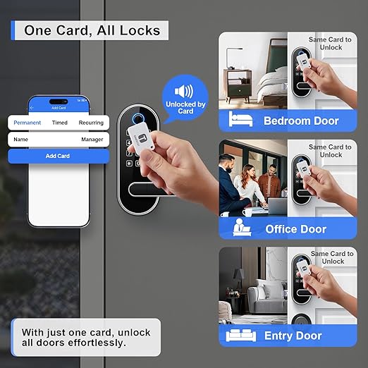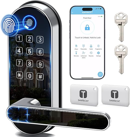 [Fingerprint Unlock - Family Friendly] Unlocking with a fingerprint takes just 0.3 seconds, offering quick access for family members; our 508 DPI high-resolution fingerprint sensor ensures up to 99.99% recognition rate; track all unlocking history using the smart app. [Code Unlock - Guest Friendly] Remotely create instant or scheduled door codes for family, visitors, and guests using the smart app, even when you are not at the property; ideal for homeowners, rental hosts, and property managers. [Secure Your Home] Automatic door locking to ensure your door is always locked after you leave; an alarm will trigger if unwanted intruders try to enter; privacy mode disables all access methods from outside when you need it; stay informed about your door's activity with all security alerts pushed to your smart app. [One Card, All Locks] Use one card to unlock all doors, eliminating the need to carry multiple keys and the confusion of which key is for which door; this feature is especially friendly for property managers who manage many properties. [Voice Control] Works with Amazon Alexa and Google Assistant for hands-free control through voice commands like "lock the front door”, "unlock the front door”, "check lock status”, etc. (Gateway Required, Sold Separately) [Locks Management] Manage all the locks via the smart app and web portal; log in web portal with your app credentials. [Easy Installation] Easy to install with just a screwdriver in 20 mins; no extra drilling needed; no hardwiring; door handle is reversible for both right-handed and left-handed doors.