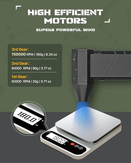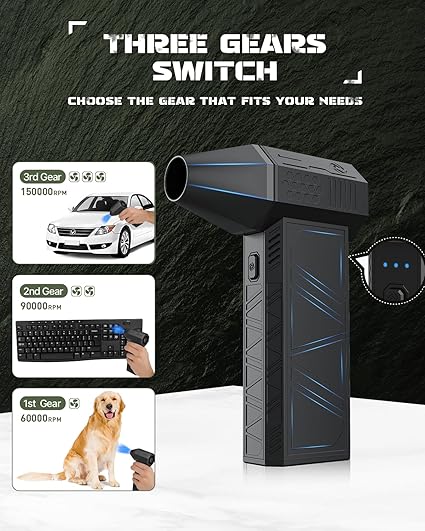 Strong Wind Force: The compressed air duster reaches up to 150,000 RPM, delivers 180 G blowing force with a maximum wind speed of 52 m/s, effectively removes debris and dust and dries surfaces quickly. It has three adjustable speed settings for various cleaning needs Portable and Versatile: Weighing 315 g, the electric air duster is lightweight and easy to carry. It's ideal for indoor use such as cleaning desktop and keyboard, drying pet hair, inflating air beds and lifeboats. It also serves well for outdoor activities such as picnics and fire-starting Fast Charging and Long Battery Life: The air duster supports fast charging up to 10W, takes 2.5 hours to fully charge and provides up to 100 minutes of use on a full charge. The battery includes temperature, current, and short-circuit protection, ensuring consistent speed and performance even with extended use Durable and Energy-Efficient: The air duster electric is constructed from durable, lightweight composite materials, featuring strong magnetic properties and a non-slip handle. Compared to traditional compressed air cans, the air duster is reusable, and offers a sustainable cleaning solution Accessories: Compressed air dusters include USB Type-C cable, user manual, storage bag, and brushes.We recommend using a 5V2A power adapter. Please avoid overcharging and placing near heat sources or flammable materials for safe use