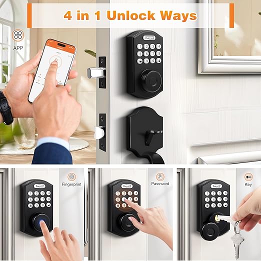 【Keyless Entry Door Lock with Knob Set】: The combination of passage door knob and smart deadbolt is more convenient,it helps customers avoid the hassle of separately choosing and matching door handles; 【4 in 1 Unlock Ways Deadbolt】: This smart lock set can be unlocked by Fingerprint, Password, App and Key, meeting various people's daily needs in multiple scenarios, and they no longer have to worry about forgetting their keys when going out; 【Fingerprint Unlock】: It uses biometric technology, with a recognition rate of up to 99.8%, it can accurately identify your fingerprint and unlock the door in just 0.3 seconds, securely accommodates up to 50 fingerprints, ensuring seamless access for multiple authorized individuals; 【Password Unlock】: This keypad lock securely accommodates up to 250 access codes for family use, and supporting setting multiple one-time passwords, which will be automatically deleted after being used to unlock the electronic deadbolt; 【Auto lock】: The smart door lock can be set to automatically lock within 5 to 60 seconds after the door is closed, avoiding the situation of forgetting to lock the door in case of emergencies, ensuring the safety of the home;