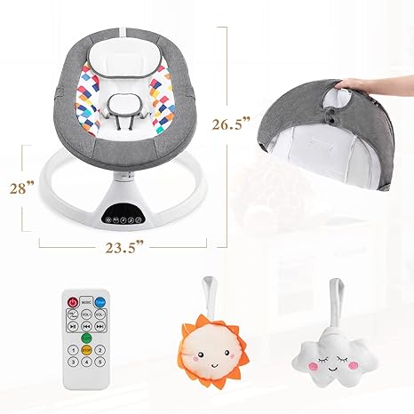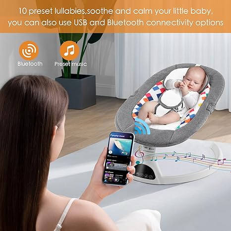 Smart design:Features 10 preset lullabies,auto-off timer design,Bluetooth and USB connectivity options are available,you can play soothing sounds or children's stories whatever you want via phone and Bluetooth connection Safe&Comfortable:5 point harness will made your baby feel safe,baby is propped and can get a good view of her surroundings,also,the soft seat will let your baby feel comfortable Easy control:Operating the Soobaby swing is very easy,you can use touch panel or remote control.Choose from 5 sway Speed and 3 time Timer settings mode What is included in package:1 baby swing,2 hanging stuffed toys,and 1 protective mosquito net.2 plush overhead toys. it's important because not only these toys entertain baby but also help improve hand-eye coordination while baby is trying to reach it. Mosquito net will keep you baby far away from mosquito Great gift for any new or old parents. Something that could be passed on for different babies.Customer satisfaction is our top priority.