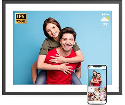 Reliable and Efficient Transmission: With this electronic picture frame, up to 30 users can connect and share photos from anywhere in the world. After connecting, you can privately share photos and videos on the electronic frame - perfect for gifting to loved ones like mom, dad, spouse, girlfriend, boyfriend or best friend. Stunning Intuitive Touchscreen: This 17-inch wifi digital picture frame features an IPS touch screen for a high-resolution photo and video browsing experience at 1280x960 pixels. The intuitive touchscreen and user-friendly interface make setting up this wifi picture frame simple, even for seniors without technical expertise. Ample Internal and External Storage: This digital picture frame with app provides 32GB of built-in storage for a large photo collection. There are no hidden fees or subscription charges associated with this WiFi electronic picture frame. Additionally, it features a USB port, Type-C port, and micro-SD card slot to significantly expand your storage capabilities. Sharing via App&Email: The Vphoto app is designed to work seamlessly with both iOS and Android phones for convenient uploading. You can upload up to 50 images and 1 video at a time directly to your Wi-Fi enabled digital picture frame with video. Additionally, you can easily add photos and videos to your 32GB large digital picture frame via email. Gifts to Express Care: This spacious 17-inch large digital photo frame makes a thoughtful, cherished gift. It offers a personal way to share treasured memories with loved ones. Whether for Mother's Day, Father's Day, Thanksgiving, Christmas, an anniversary, birthday, or graduation, this modern wall mountable digital frame will be treasured for years.