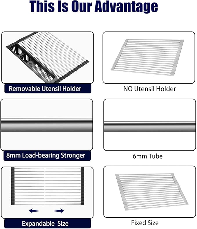 ????INNOVATIVE EXTENDABLE DESIGN: This roll up dish drying rack is designed with retractable structure, the length can be extended up to 22.3 inches, easily adjust the right length to fit in with your usage needs. The sink drying rack is a perfect fit for your home kitchen sink,farmhouse sink and RV sink. ????INCLUDES REMOVABLE UTENSIL HOLDER: The well-made utensil holder expands with the length of the sink dish drying rack and can also be easily removed for separate use as a drainer. Warm Tips: Depending on the different size of each sink, you may lose some used space of the cutlery holder. ????SPACE SAVING AND EASY TO STORE:In the limited space kitchens, use this roll out sink drying rack crossing the sink,then you can make full use of the sink space. When not in use, simply roll up and reduce to its shortest size and place it on the utensil holder to save kitchen counter space. ????HIGH QUALITY MATERIALS: The kitchen sink drying rack is made of premium and enlarged 304 stainless steel, which has more weight-bearing capacity than similar products. The stainless steel tubes are fitted with BPA-free silicone at both ends to ensure that the dish drying rack does not slide on the sink. ????MULTIFUNCTIONAL USE AND HEAT RESISTANT: This foldable dish drying rack can quickly dry your bowls, cups, plates, pots, pans, cutlery, etc., as well as drain water stains from vegetables and fruits. In addition, it can also be used as a defrosting tray or a perfect trivet mat, which is a must-have good helper for your home kitchen. ✅This innovatively designed expandable dish drying rack not only effectively solves the problem of limited space in the kitchen, but also meets the diverse needs of use, bringing convenience and efficiency to your daily kitchen work.
